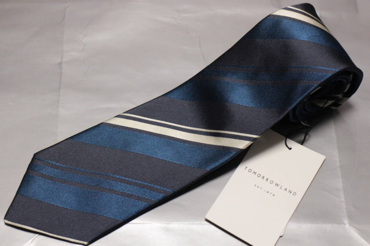 - トゥモローランド新品ネクタイ美麗艶ネイビー*ロイヤルブルー*シャンパンシルバーレジメンタルサテン織切返しフルハンドメイド