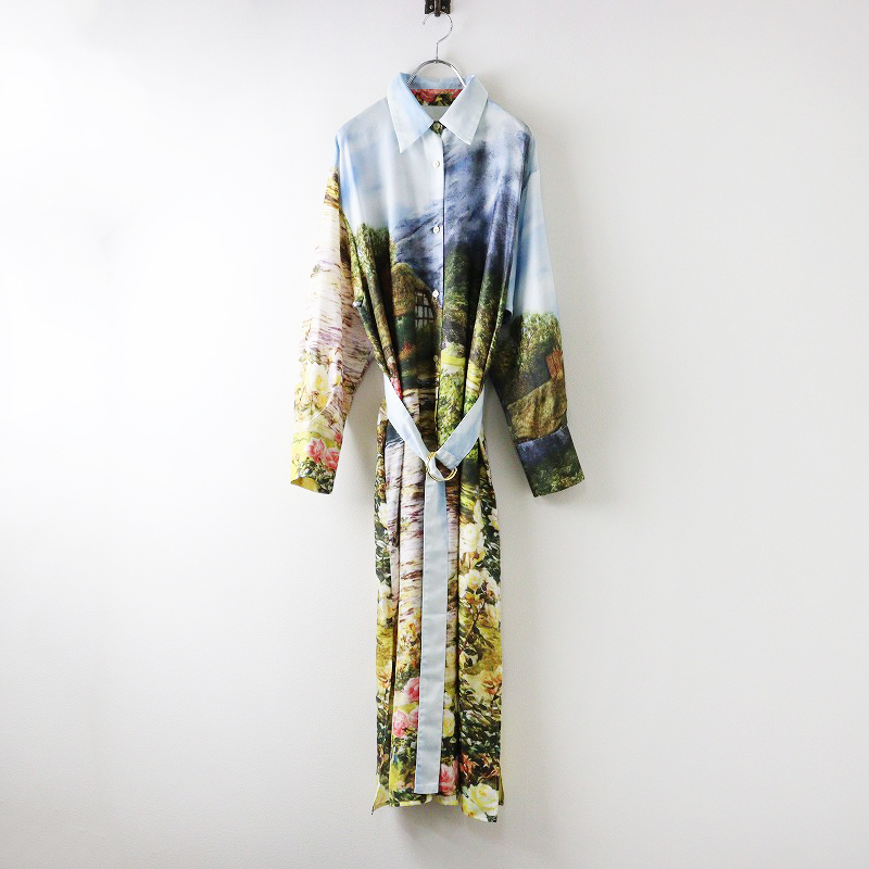 - 2023AW ロイスクレヨン Lois CRAYON ランドスケープ柄サテンシャツワンピース M\マルチカラー 風景画 ドレス ベルト付【2400014605501】