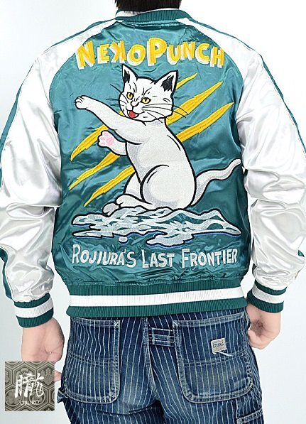 - 猫パンチスカジャン◆朧 ブルーグリーン×シルバー Lサイズ 9033817 おぼろ ネコ ねこ スーベニアジャケット 刺繍