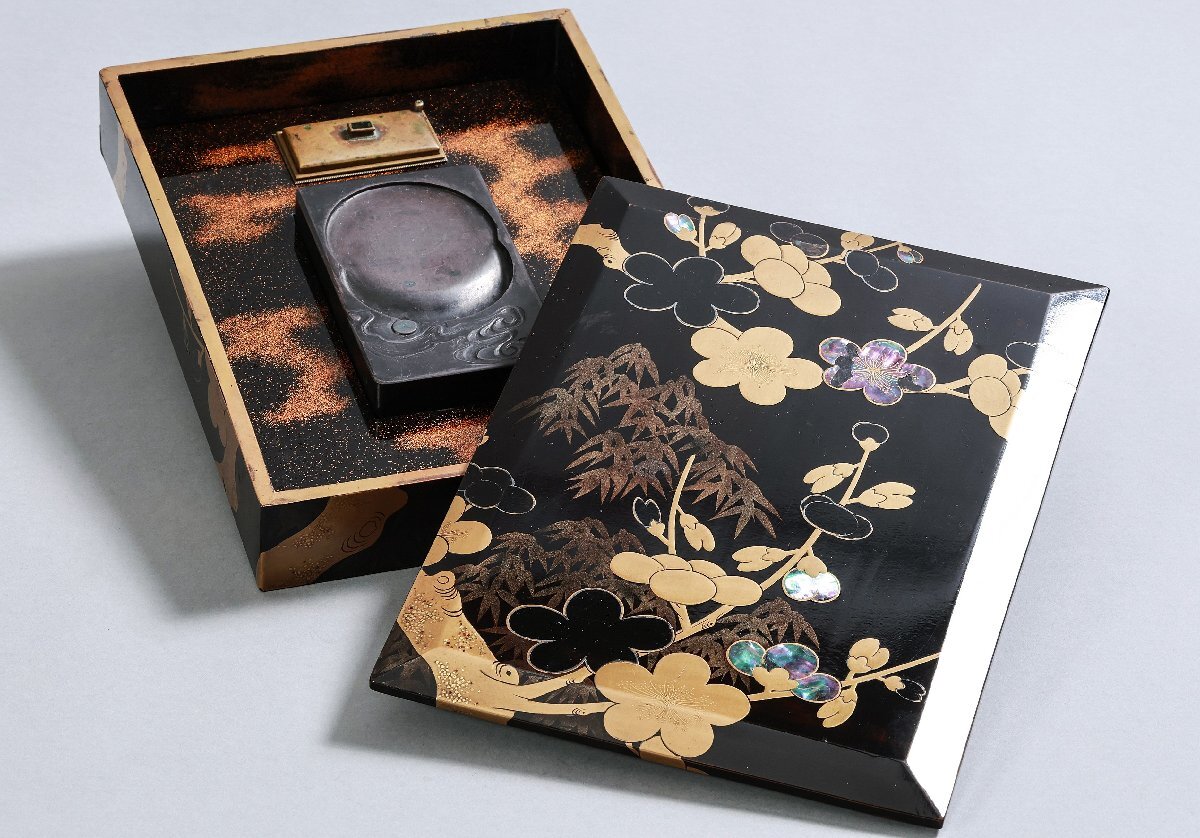 ・時代漆美術 梅蒔絵螺鈿細工 硯箱 時代箱 黒漆 /漆器 蒔絵美術 書道具