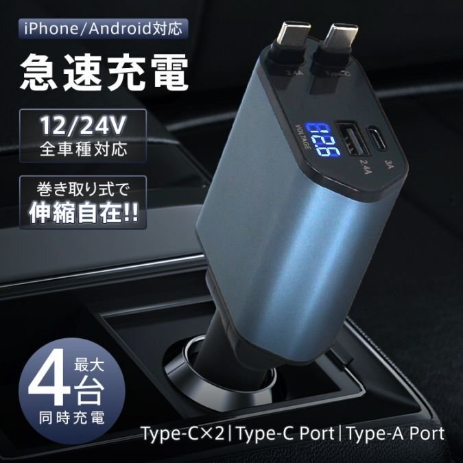 - カーチャージャー Car Charger 12/24V 100W 急速充電 Type-C*2 Type-A Port*1 Type-C Port*1 LED電定 卷き取り式 最大4台同時充電 全車