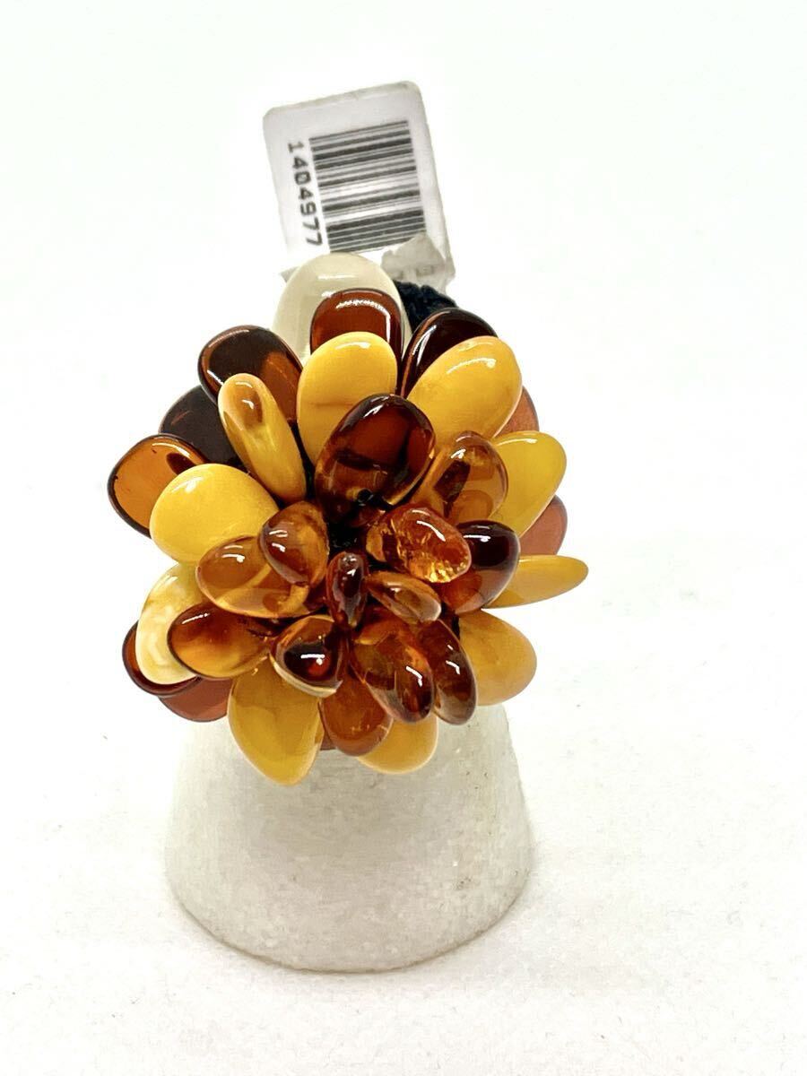 - 【新品】リトアニア産琥珀フラワーデザインリング/アンバー×レッド琥珀×ミルキー琥珀/サイズフリー/指輪/トリプルカラー/こはくコハク