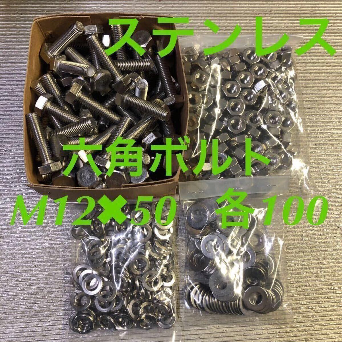 - ★送料込★ステンレス 六角ボルト M12×50 ナット・平ワッシャー・スプリングワッシャー 各100個 ステン六角ボルト