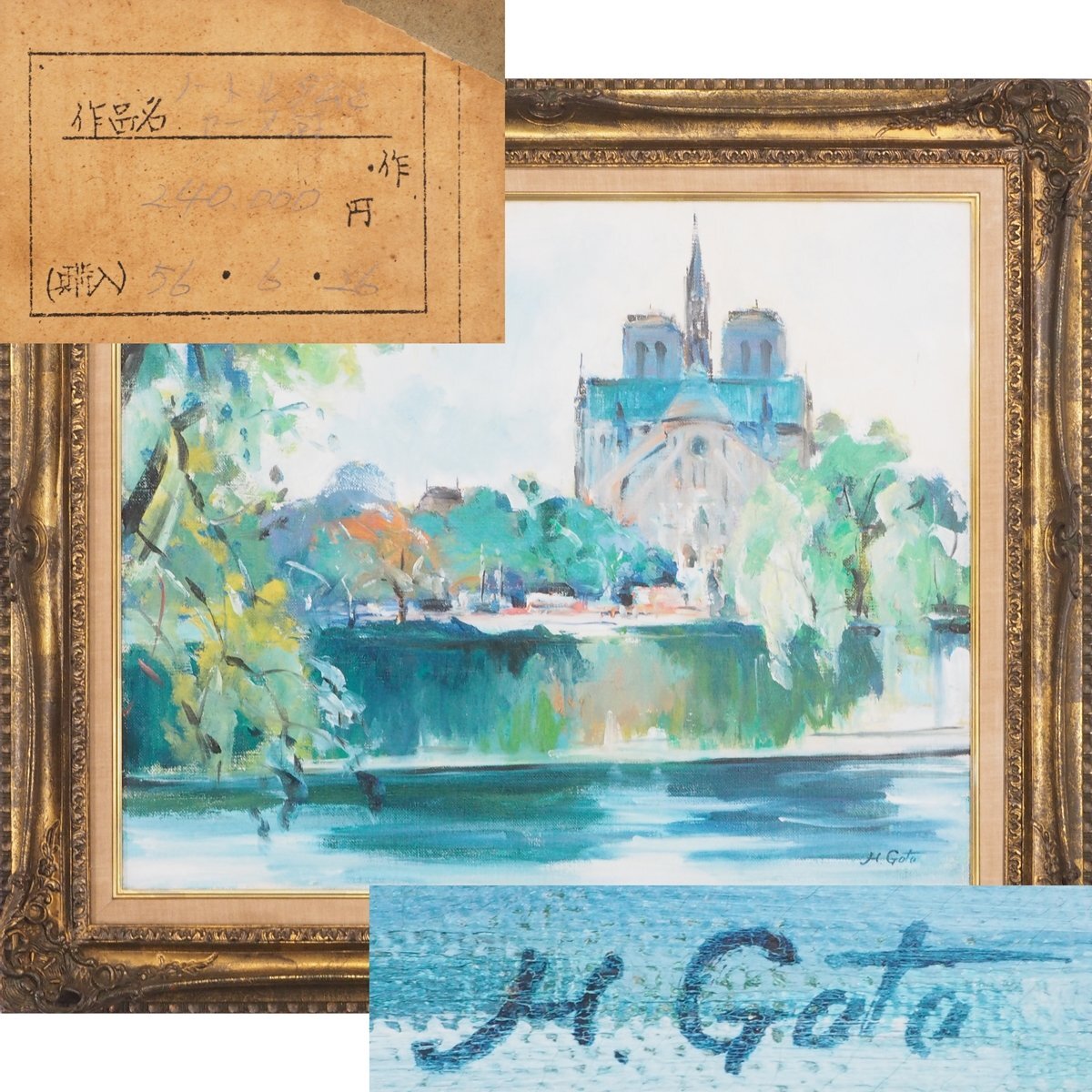 > 【真作】【渡鹿庵】[後藤弘] 20867 絵画 油彩画 「ノートルダムとセーヌ河」 15号 風景画 一線美術協会 在銘