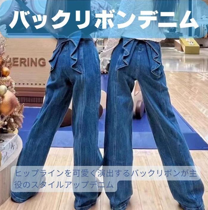 - バックリボンデニム デニムパンツ フレア 脚長効果 ハイウエスト Lサイズ