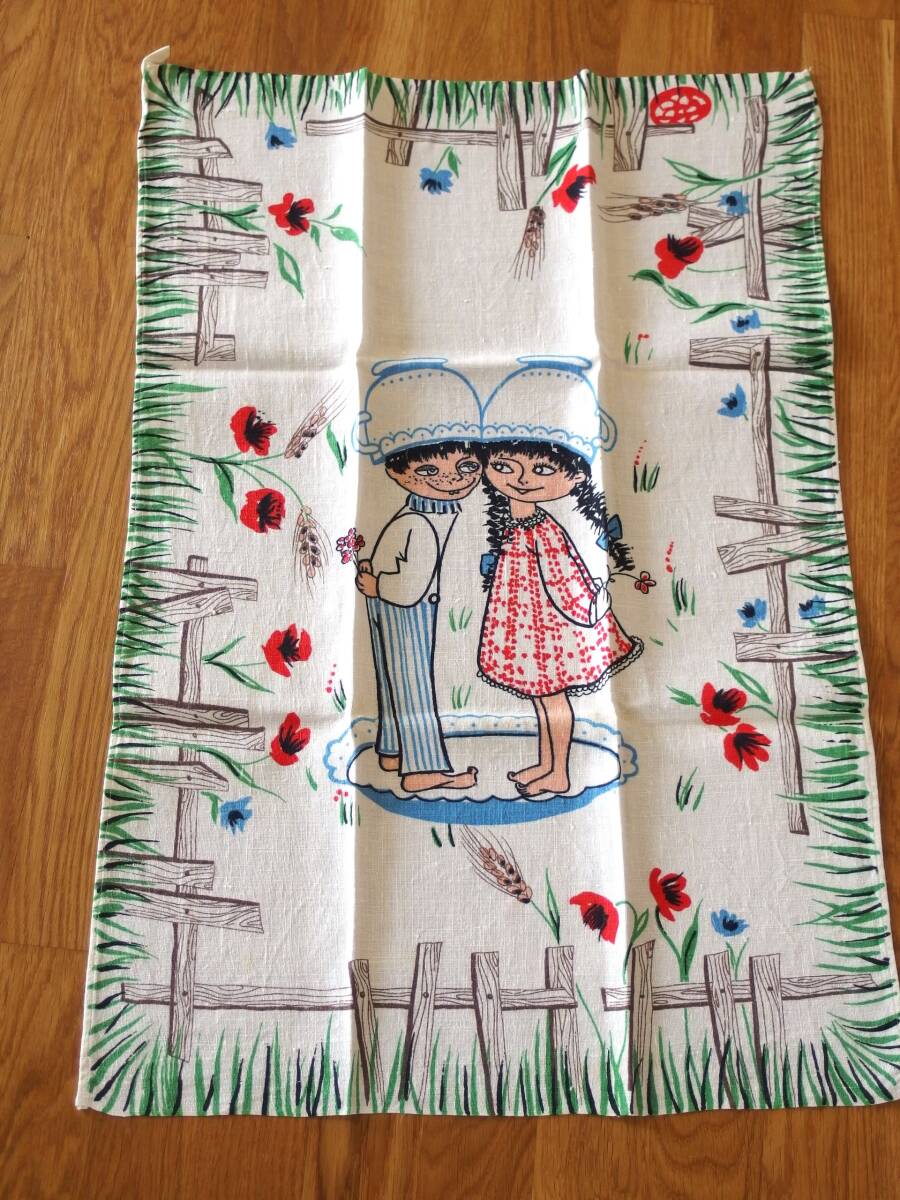 - イタリア製 bassetti ヴィンテージ&レトロ キッチンクロス/ティータオル/タペストリー (ティーカップが頭に乗った男の子&女の子 )