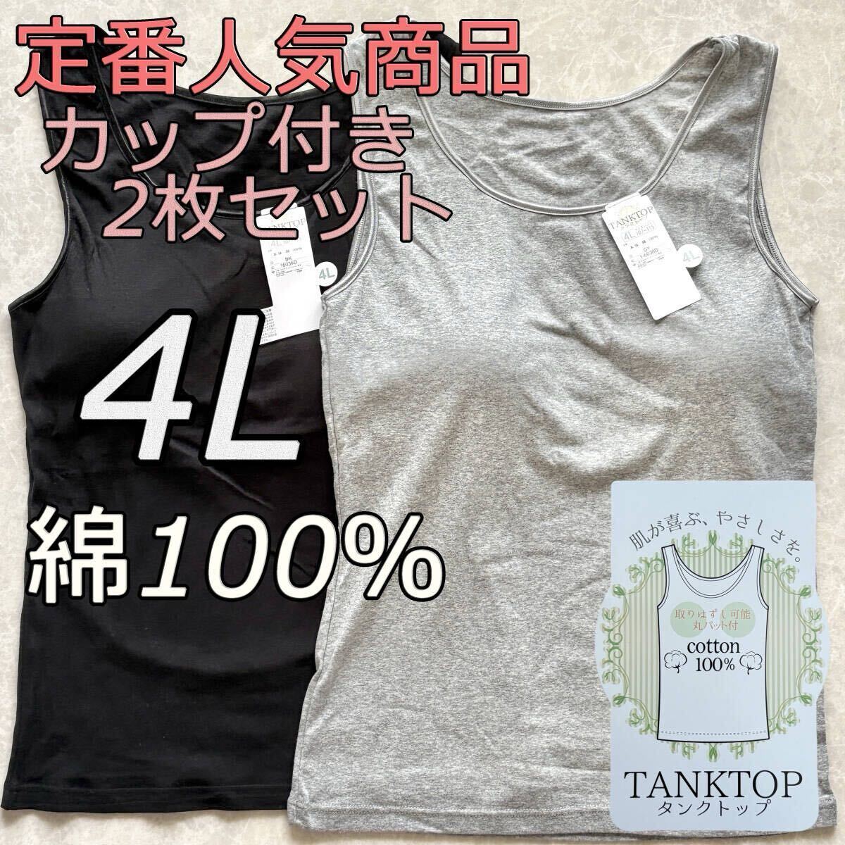 > レディース 4L 2枚組 綿100% カップ付き タンクトップ ブラトップ インナー ノンワイヤー 肌着 ルームウェア ブラジャー スポブラ gb