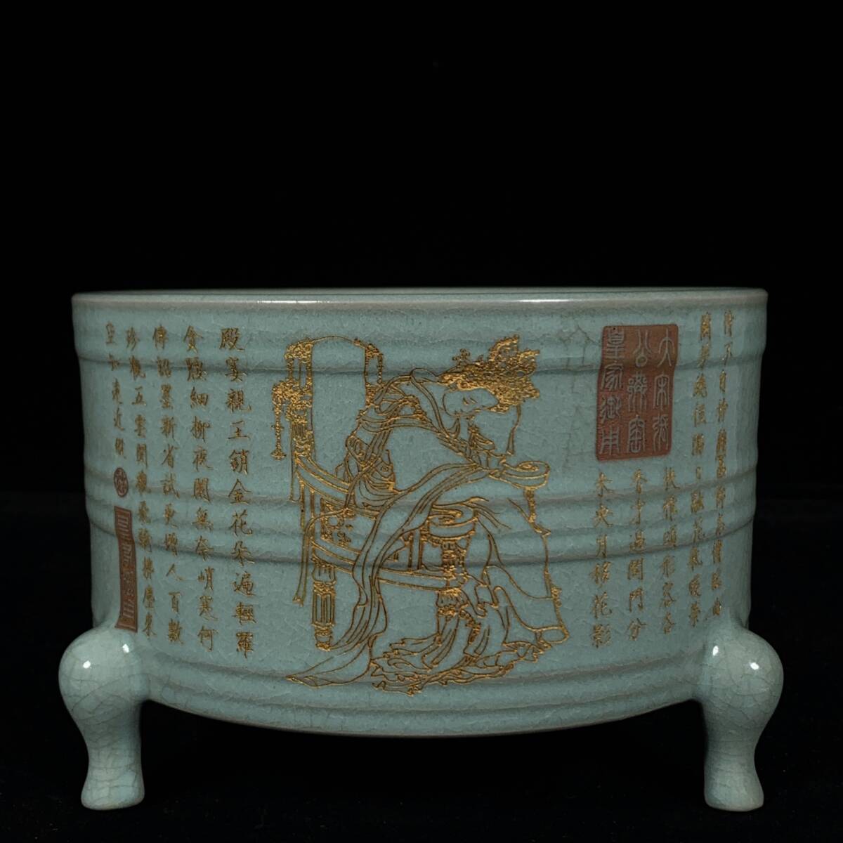 > 宋時代 古陶磁器 汝窯 銘文刻 仕女三足洗 鼎 文案 置物 擺件 時代物 古董品 骨董 旧家蔵出し 唐物 中国古玩 古美術品