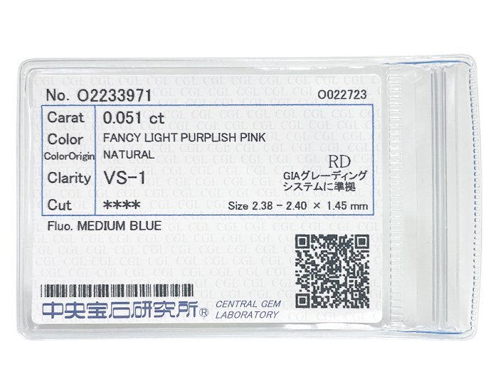 - 天然 ピンクダイヤモンド ルース 0.051ct FLPP FANCY LIGHT PURPLISH PINK NATURAL VS-1 RD MEDIUM BLUE 中央宝石研究所ソーティング付