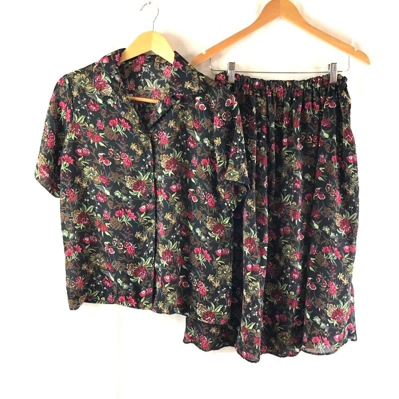 - セットアップ 半袖カットソー ロングスカート 花柄 ボタン 紐付き 薄手 スカート裏地付き 黒 赤 2025082900305