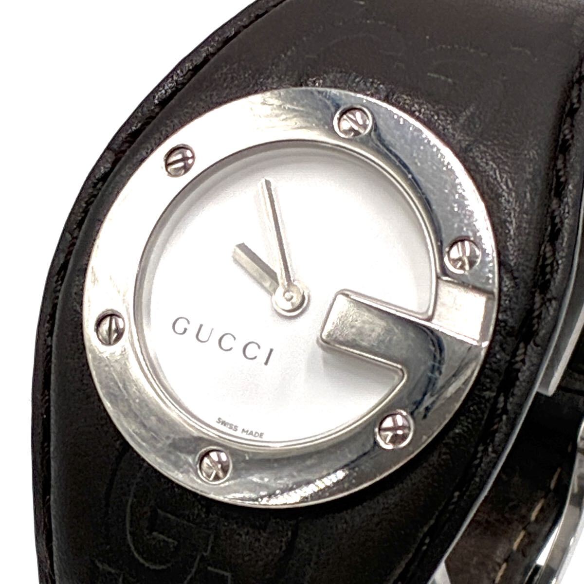 - 1円 GUCCI グッチ メンズ 腕時計 Gバンデュー シマレザー アクセサリー時計 GG 白文字盤 箱付き ダークブラウン 刻印 正規品 稼動品 104