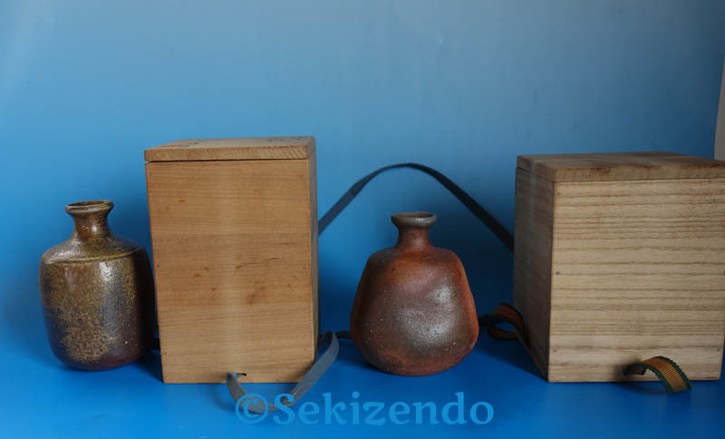 - 備前焼 A 胡麻 徳利 花入 藤原謹 合せ箱 B 桟切り 徳利 花入 合せ箱 横山伸一 酒器 2点