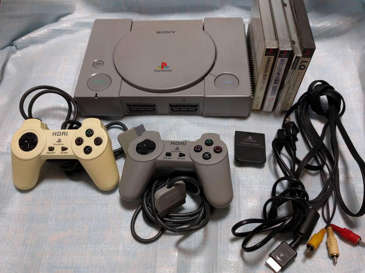 > 分解掃除&動作確認済み playstation SCPH 7500 or7000 コントローラー2つ メモリーカード ケーブル2本 ソフト4本 80サイズ