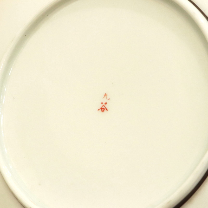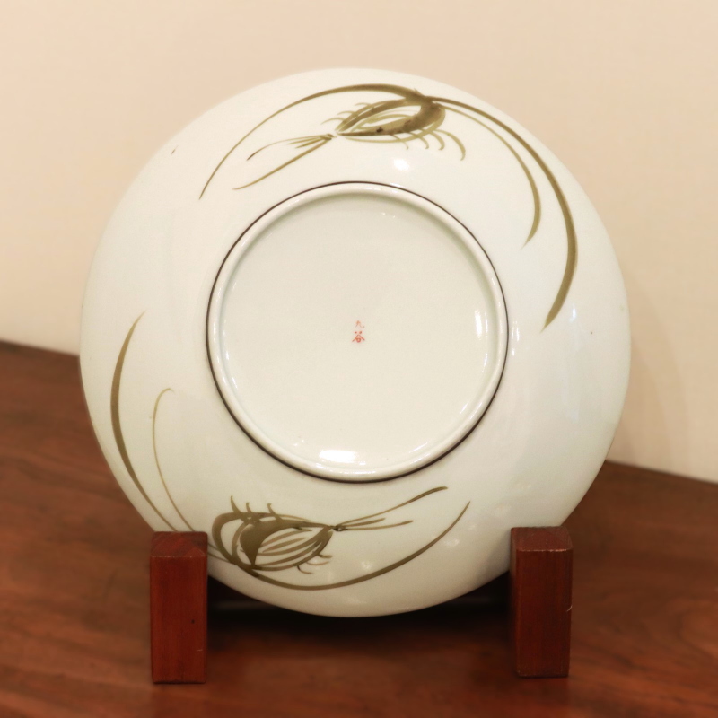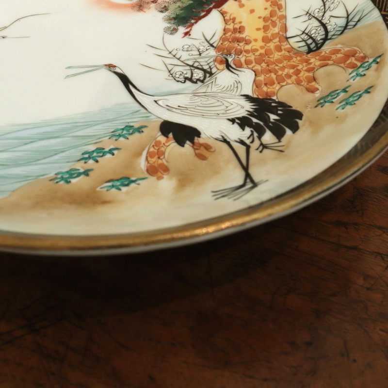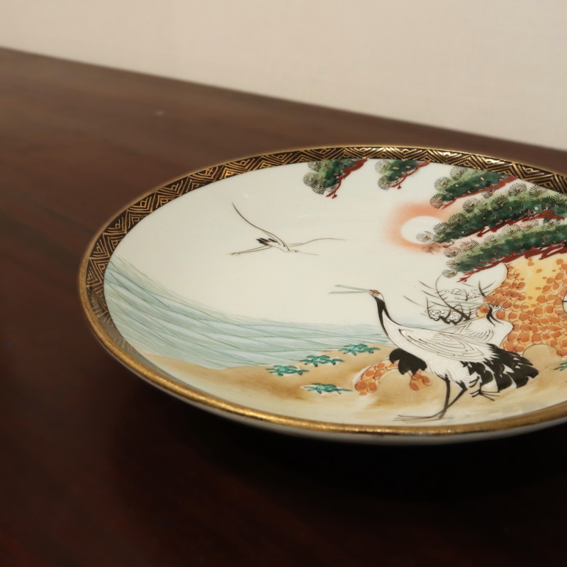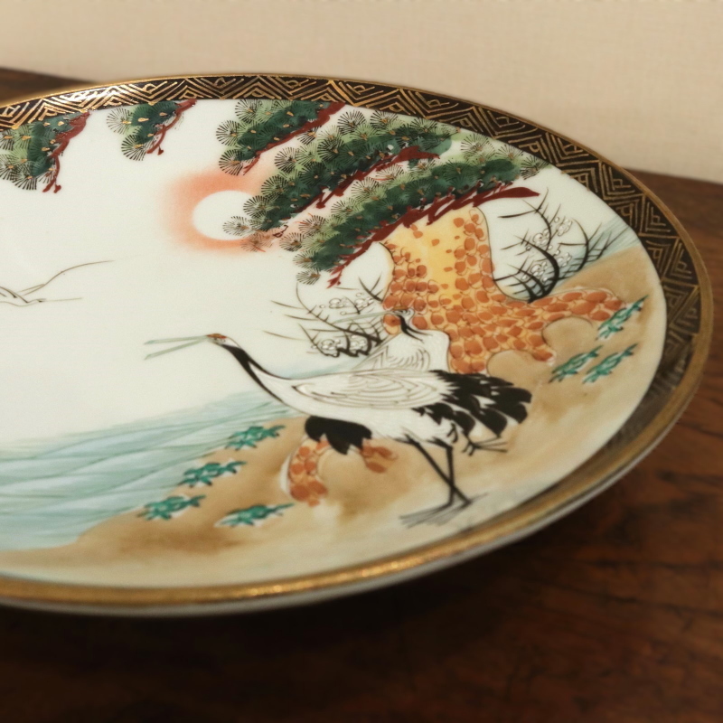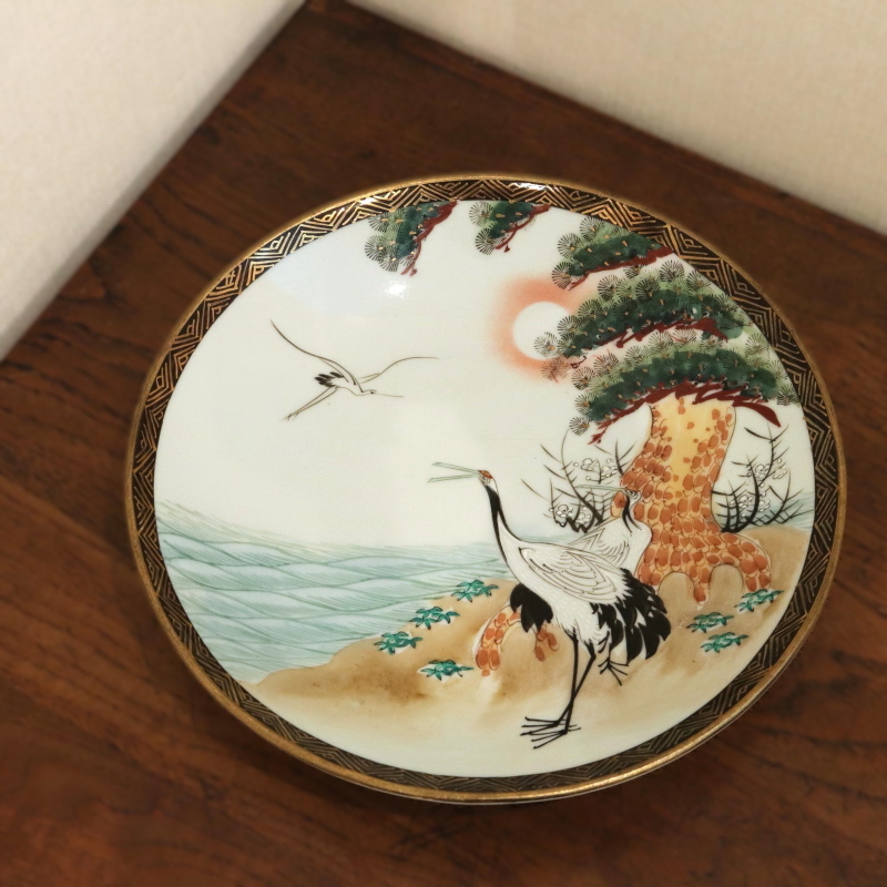 - 204■ 中皿 8寸 九谷焼 旭に松、鶴文 金彩