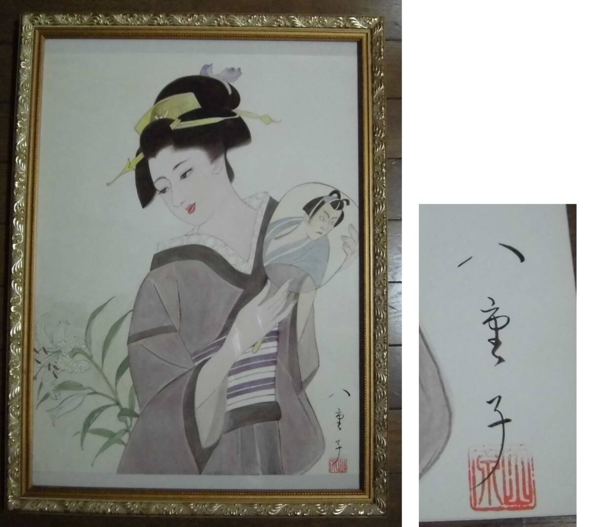 > 肉筆 紙本 八重子 在銘(印)有り ガラス 木製額縁入り 美人画 町娘 浮世絵 日本画 壁掛け 飾り物 工芸品 レトロ 「真作」