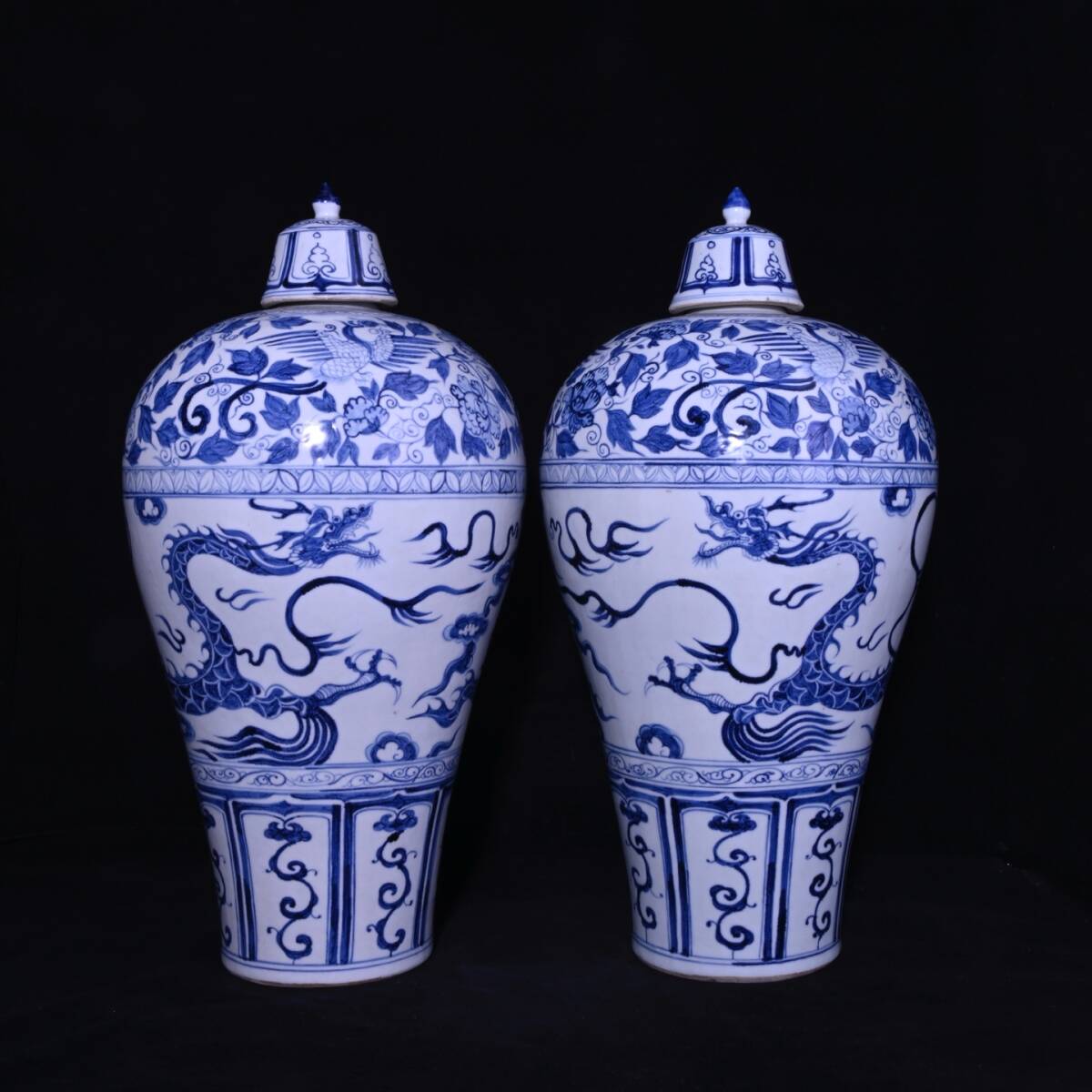 - 9+GV9217「東洋美術」 中国骨董 人間国宝 磁器製品【龍の模様が描かれた青と白の梅の花瓶一組】 旧物 孤品 珍品 陶磁器 収蔵価値が高い