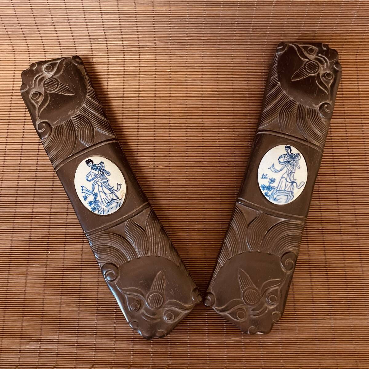 - £‰ 文房具 ‰£ 希少 檀木製 美人図 文鎮 鎮紙