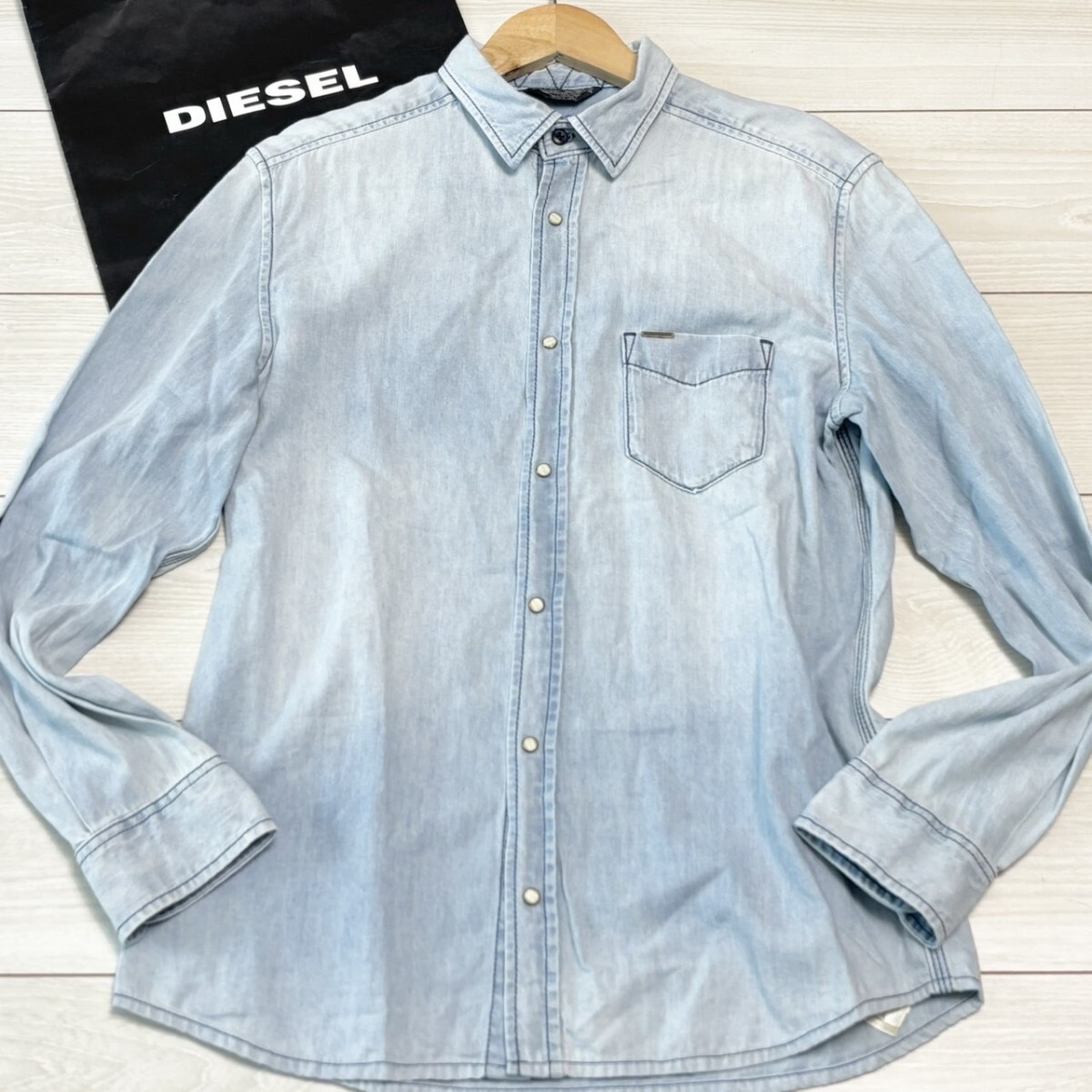 > 美品/Mサイズ●ディーゼル DIESEL デニムシャツ 長袖 スナップボタン プレートロゴ コットン ライトブルー