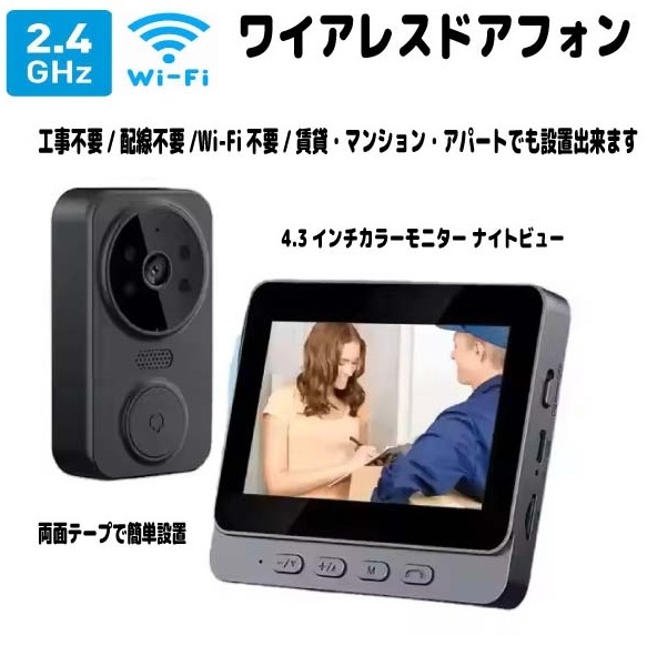 > ワイヤレス ドアフォン インターホン ドアチャイム 4.3インチ液晶 工事/配線/Wi-Fi不要 2.4GHz IP65 日本語メニュー操作で安心!