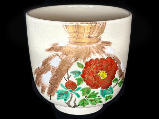 - 茶道具●抹茶碗●銘あり「東雲窯」●筒形●寒椿●寺崎大賀堂の紙箱入り
