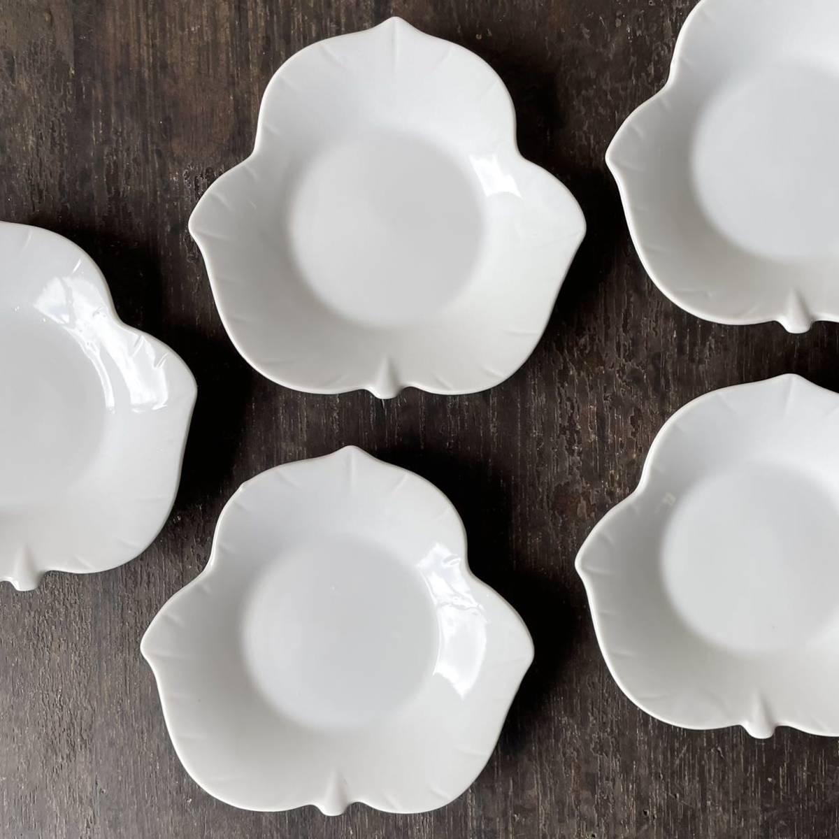 > 5枚set 葉モチーフ 白磁 小皿 白磁 デットストック 1970年代貿易 検: 茶托 銘々皿 豆皿 小皿 取り皿 レトロ 陶器 アンティーク ビンテージ