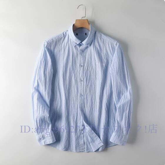 > ★新品XL 青 シアサッカー綿麻 楊柳 クレープ 長袖 サマー シャツ レギュラーカラー 軽やか ボタンダウン コットン リネン 薄手 春夏