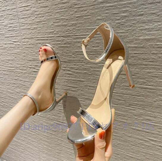 > ★新品レディース サンダル ストラップ きれいめ 華奢ストラップ シルバー 23.5cm(37) アップグレードシルバー(9cmヒール)お色選択可