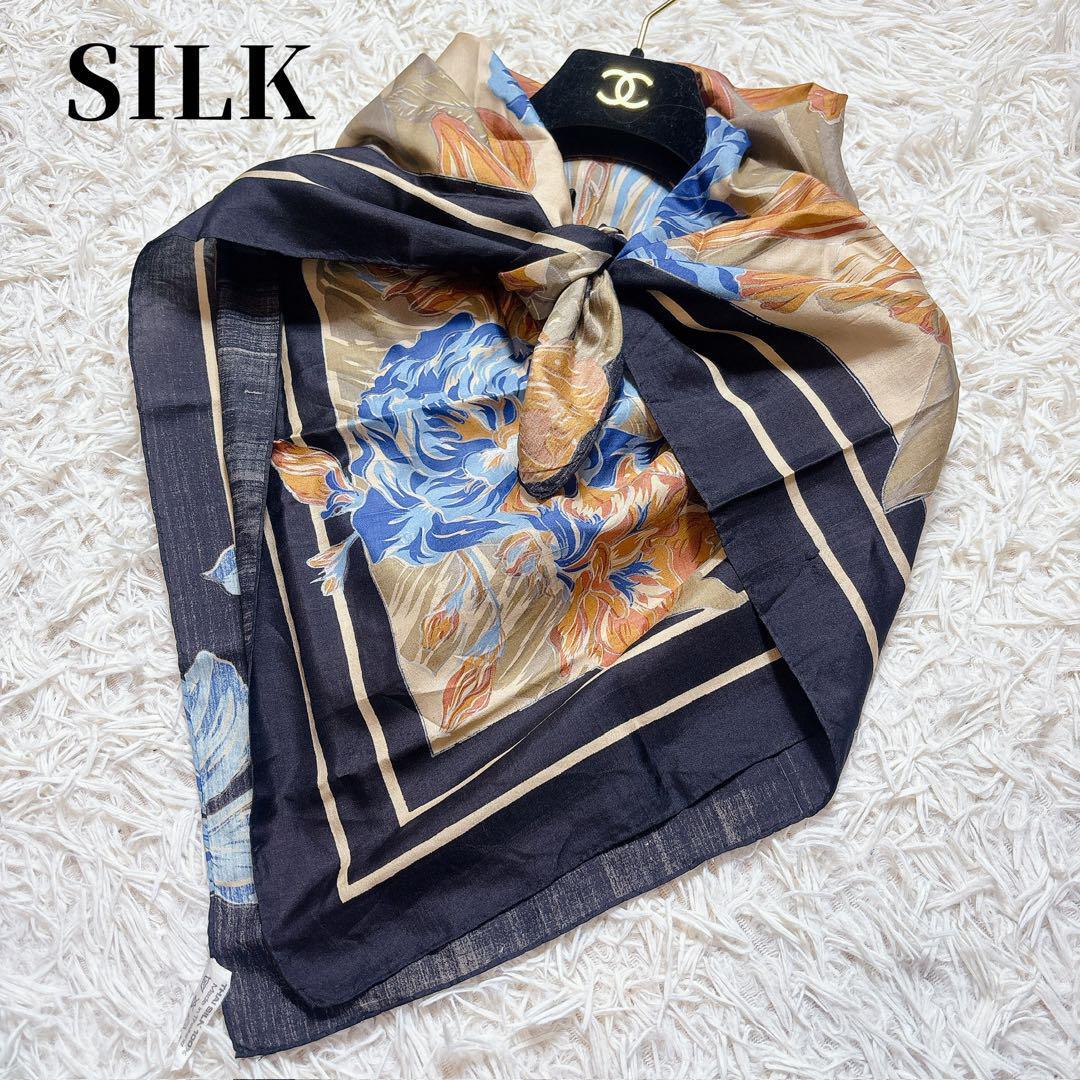 - 美品 タイシルクスカーフ 大判 上品 高級感 バンダナ ショール 総柄 ボタニカル 花柄 フローラル 和風 エレガント シック ヴィンテージ