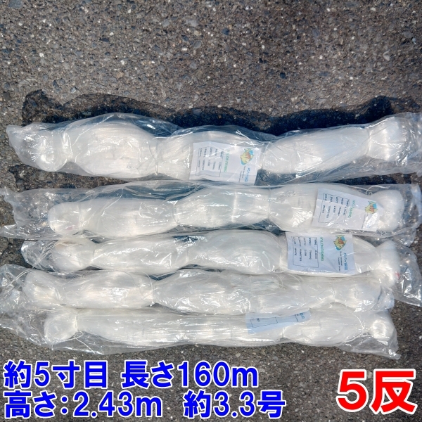 - 漁網 刺し網 刺網 5反 約5寸 長さ160m 高さ2.43m 約3.3号 白色 漁具 漁業 原反 5個
