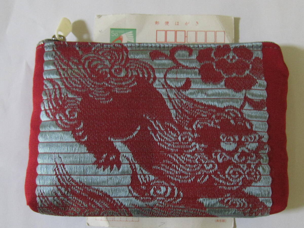- 手作り 着物リメイク 大 ポーチ 花 ライン 獅子 模様 帯 古布 レトロ ハンドメイド 財布 小物 格安 充電器 眼鏡 男女 兼用 お洒落 赤 幅広