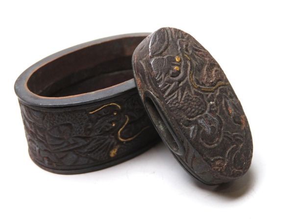 - 【11864】刀装具 武具 江戸~明治 鉄 龍彫金 縁頭(初品・買取品)