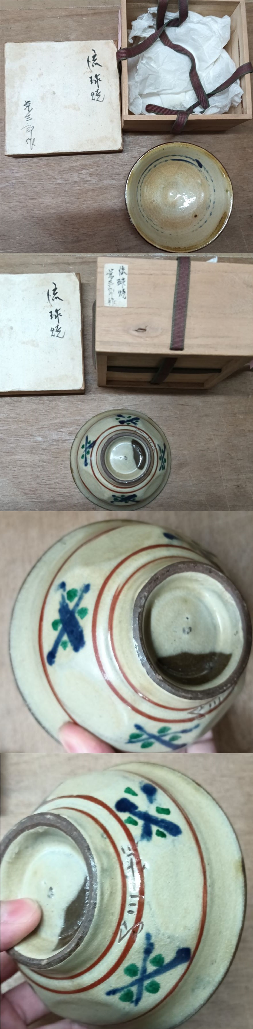 > 琉球焼 新垣栄三郎 色絵 茶碗 13.5x6cm 共箱 民藝 やちむん 沖縄 琉球