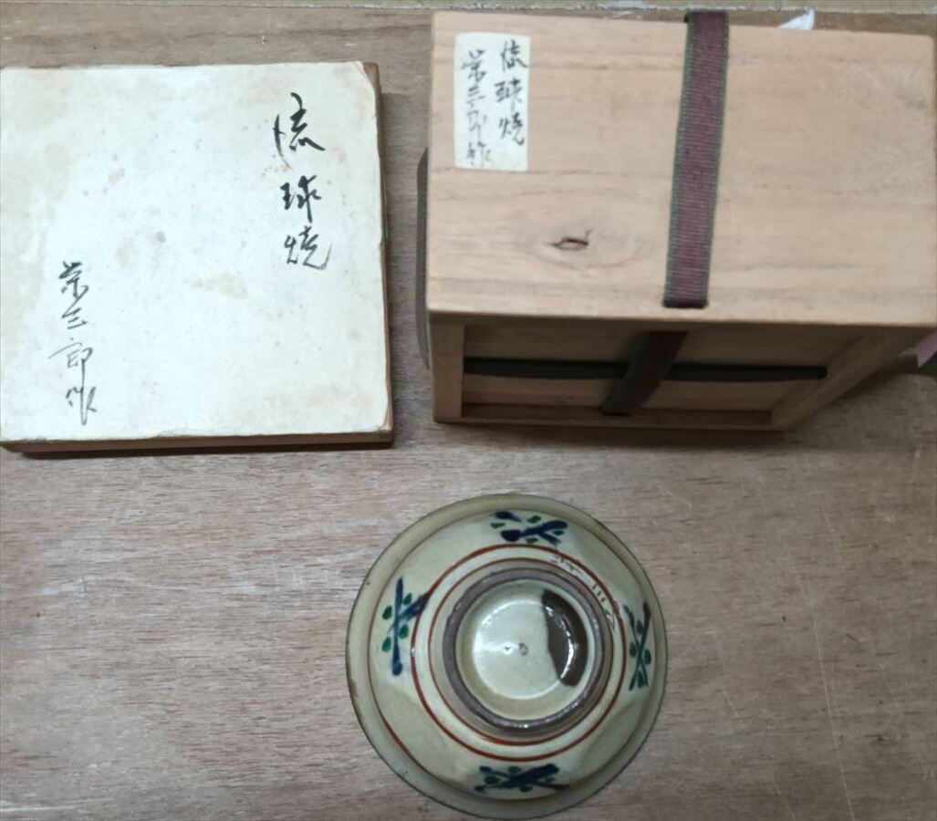 - 琉球焼 新垣栄三郎 色絵 茶碗 13.5x6cm 共箱 民藝 やちむん 沖縄 琉球