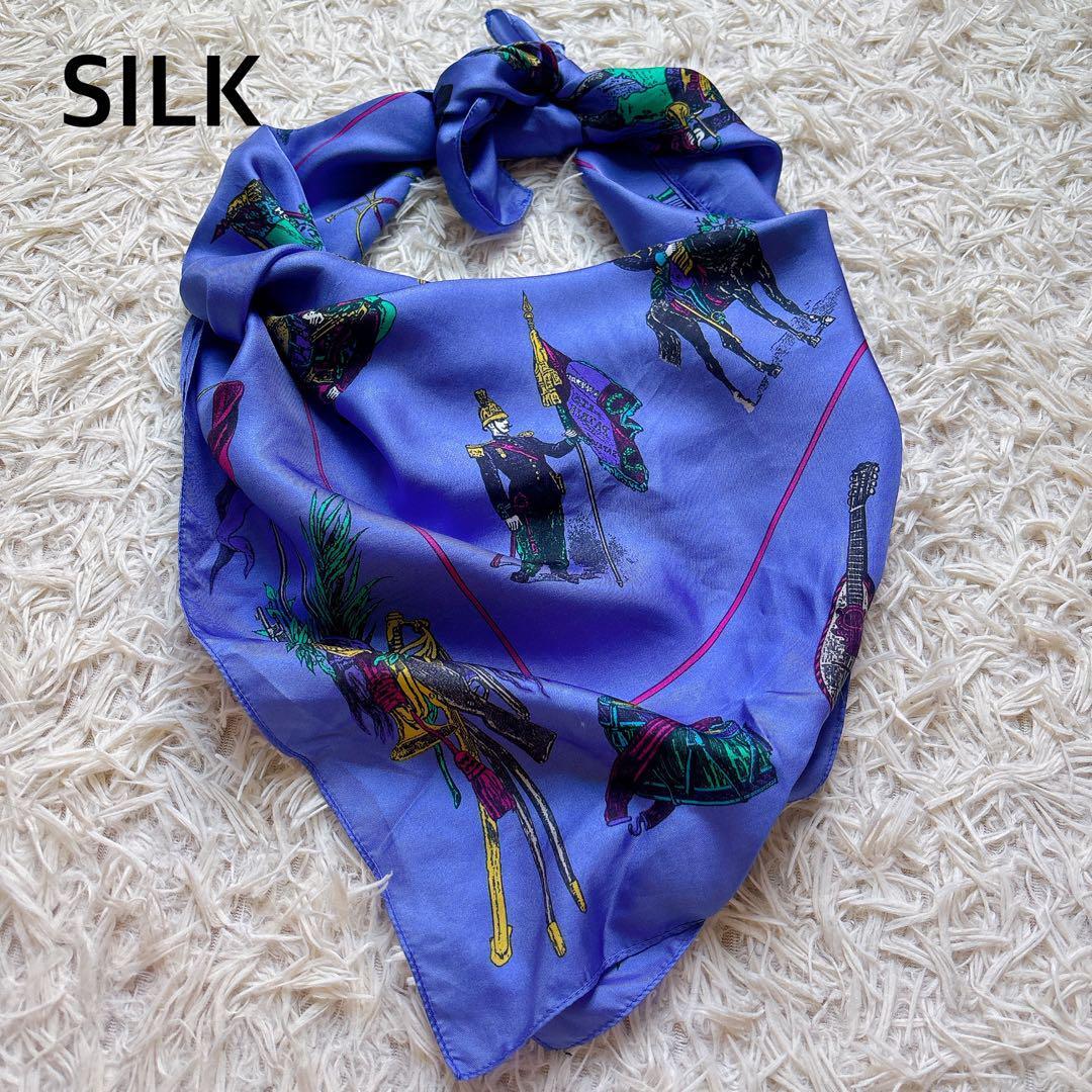 - 美品 シルク100% スカーフ バンダナ ショール 騎士 ヨーロッパ 兵隊 大判 オフィスカジュアル 高級感 総柄 ヴィンテージ オールシーズン