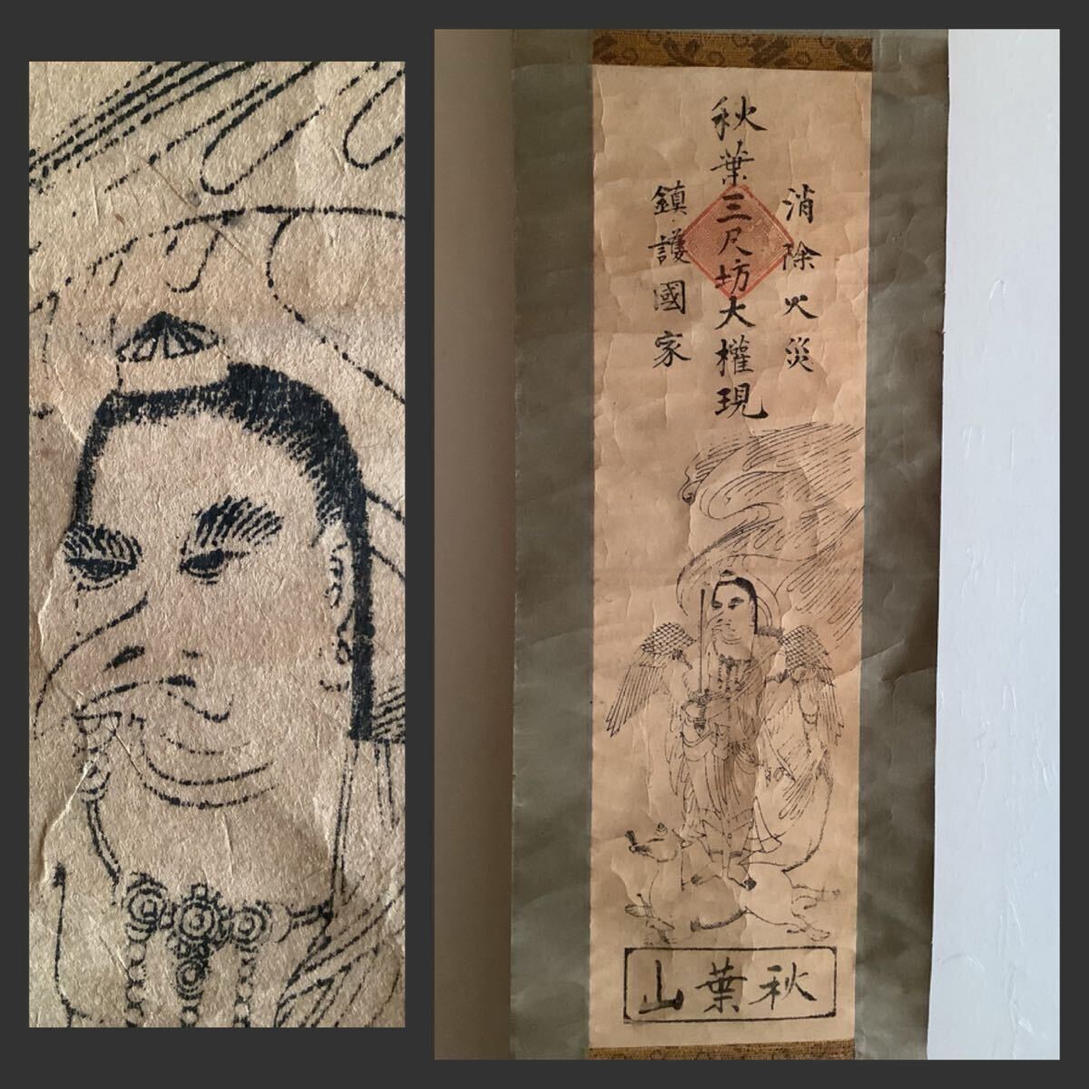 > 掛軸Sep782[秋葉三尺坊大権現]紙本版摺 木版画/送料430円 神仏画 神道神教 火伏せの神 神仏習合 白狐 天狗 古書 鎮護国家