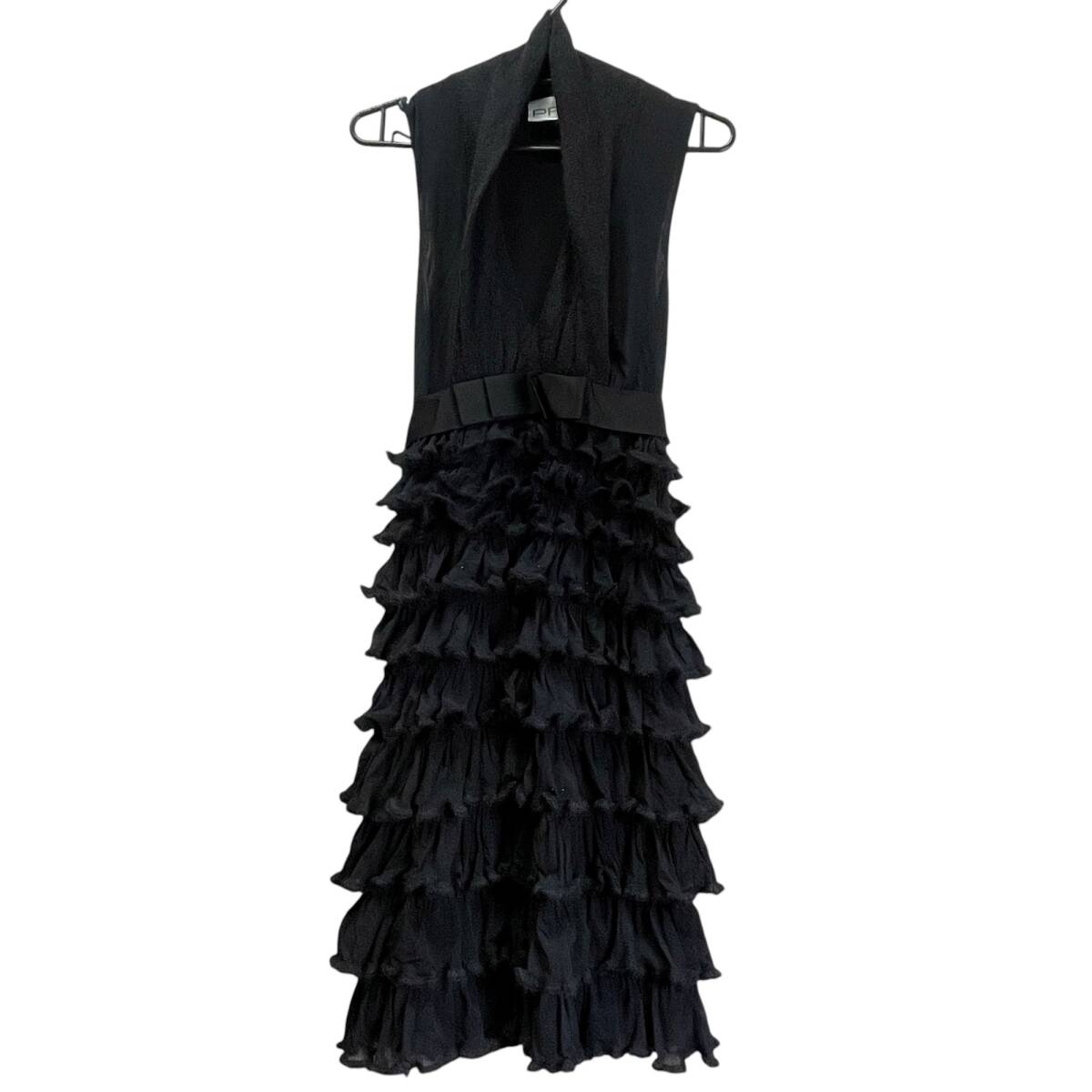 - PAOLA FRANI パオラフラーニ ティアード ドレス ワンピース ブラック系 異素材ミックス ウエストリボン ラインストーン 黒石 レディース