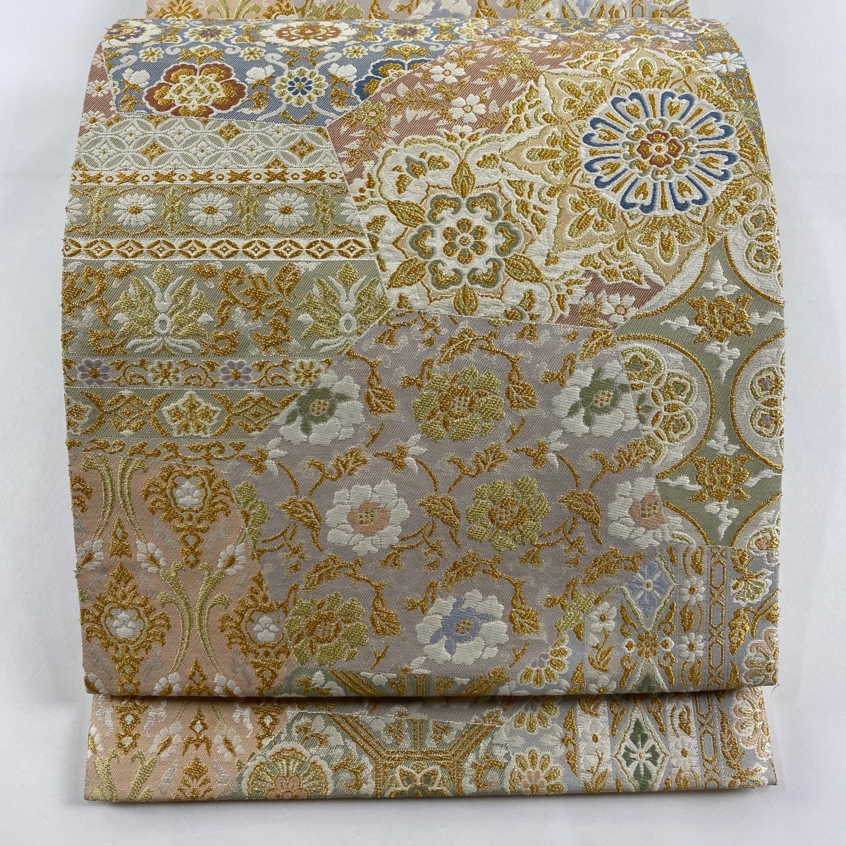 > 袋帯 秀品 亀甲裂取華文 草花 金糸 刺繍 灰緑 六通 正絹 【中古】