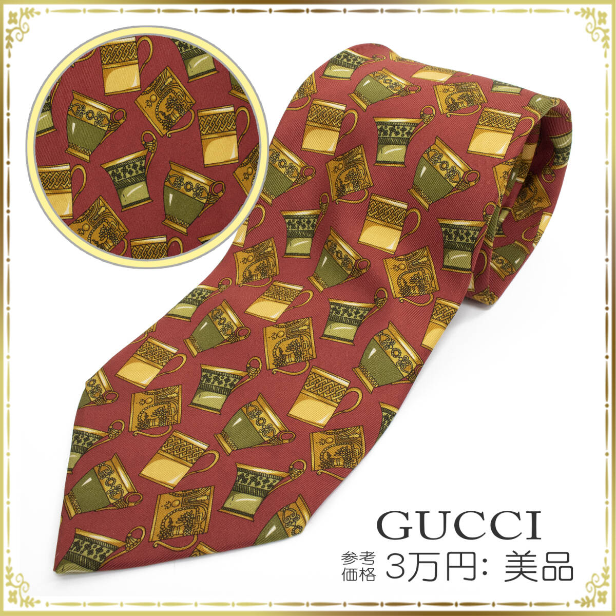 > 【全額返金保証・送料無料・美品】グッチのネクタイ・正規品・ティーカップ総柄 希少 クラシカル トラッド レッド系 ビジネス メンズ