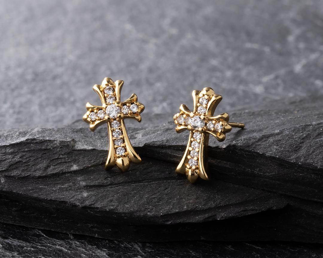 - ゴールドピアス 純銀製 クロス ピアス 両耳 ドロップ 十字架 新品 74