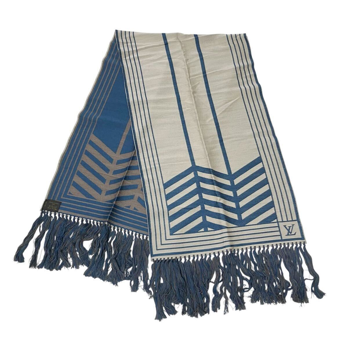 > 【美品】ルイヴィトン LOUIS VUITTON エシャルプ ロゴ マフラー フリンジ ベージュ ブルー