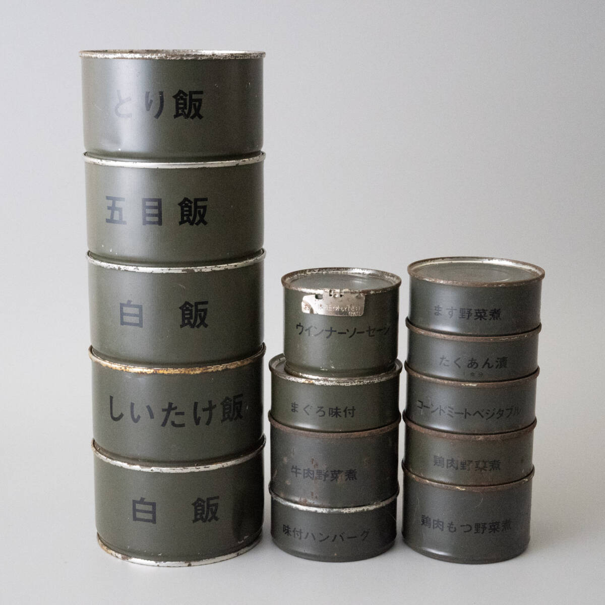- 【当時物】自衛隊 非常食 携帯缶詰 14個まとめて とり飯 五目飯 白飯 たくあん漬 牛肉野菜煮 まぐろ味付 味付ハンバーグ 戦闘食ミリメシ飯