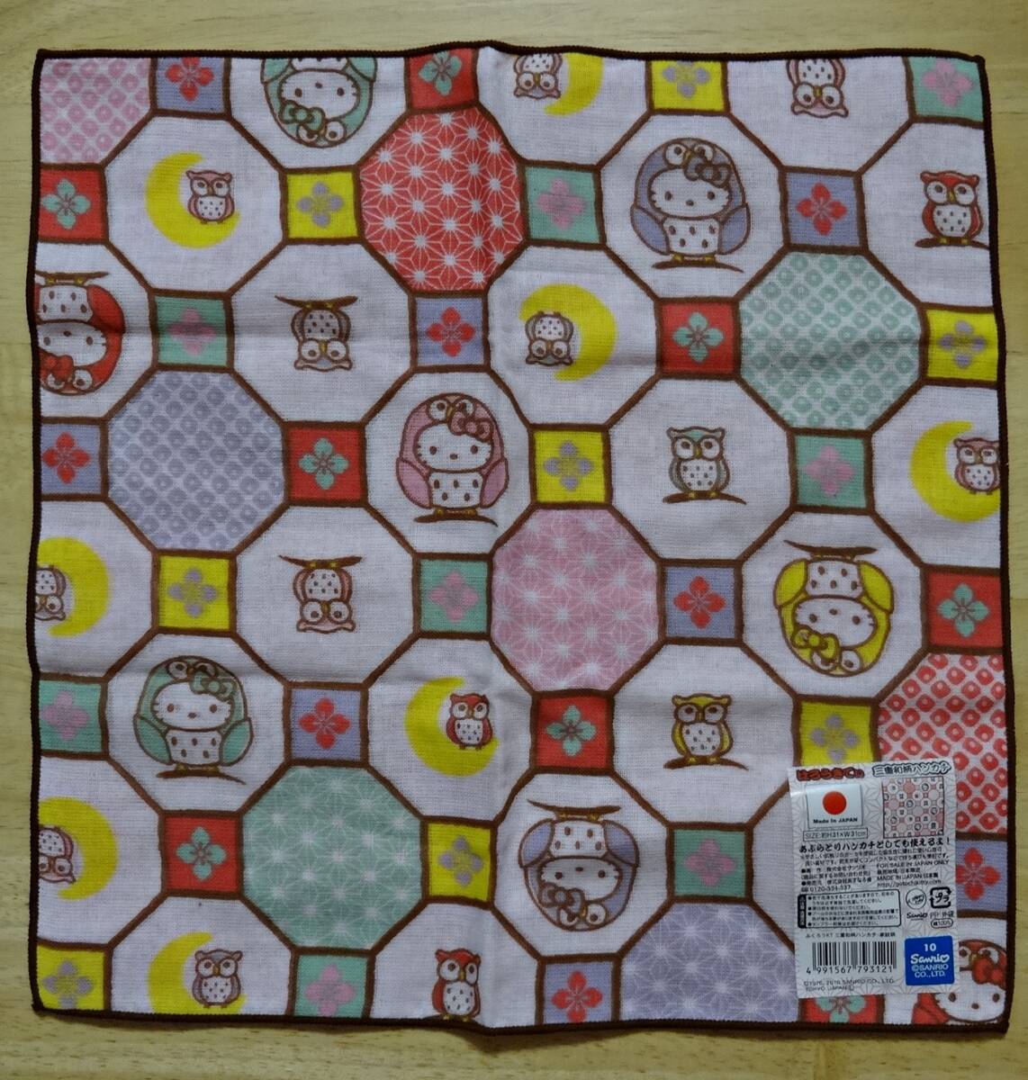 - レア★ハローキティ/はろうきてぃ★ふくろう柄★三重和柄ハンカチ★家紋柄★2010年★被り物★未使用★日本製★桜模様★ミニタオル