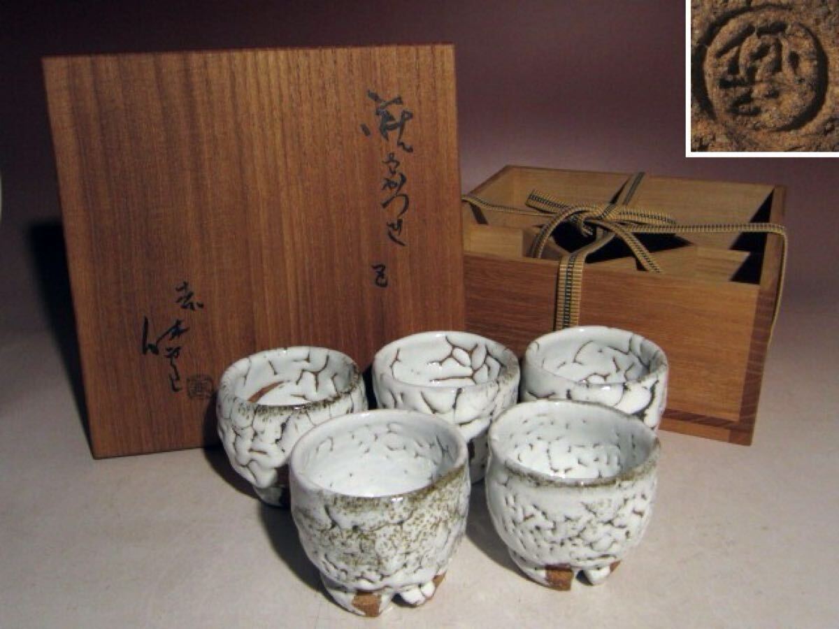 - 人間国宝 十一代三輪休雪 萩焼盃 猪口 五客★迫力のある逸品★o694