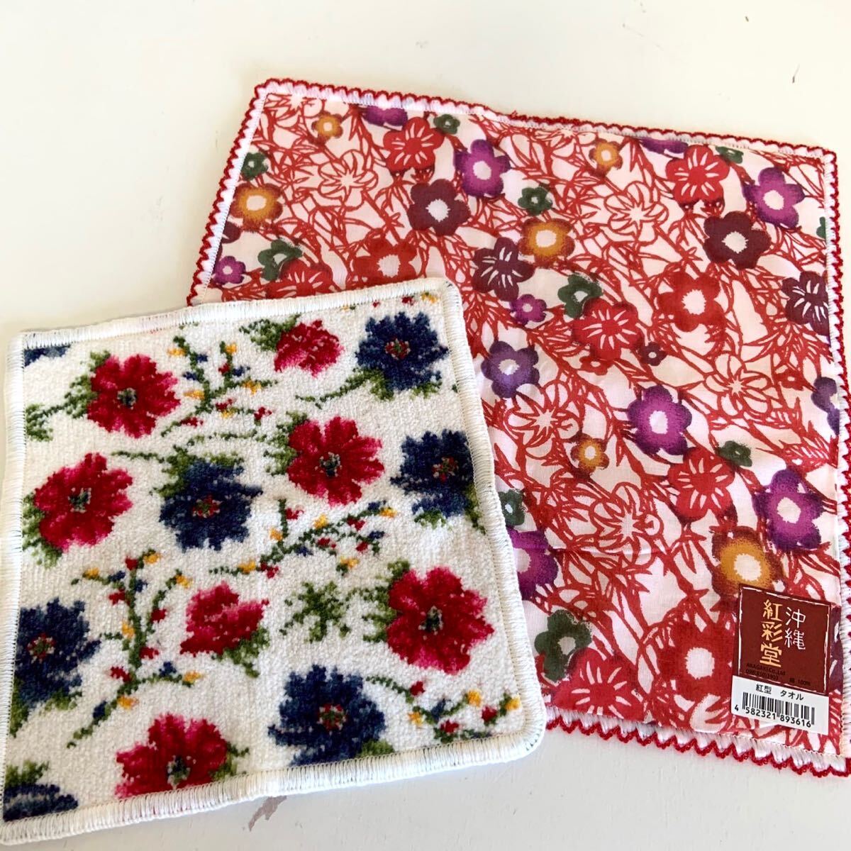 - 未使用 Enjeau アーンジョー 沖縄 紅彩堂 タオルハンカチ 2点セット 総柄 花柄 レディース タオル ハンカチ まとめ売り