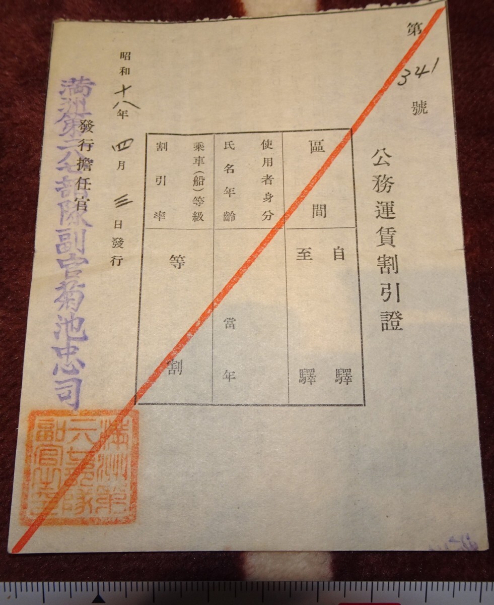 - rarebookkyoto m381 満洲 帝国 南満洲鉄道 第287部隊 公務運賃割引証 1944 年 新京 大連 中国 溥儀