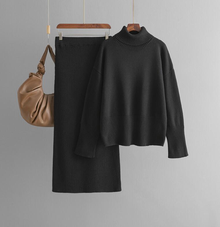 > 346 スカートスーツladiesレディース ◇ ニット素材 上質 ◇ 秋冬 上下セット タートルネック ブラック