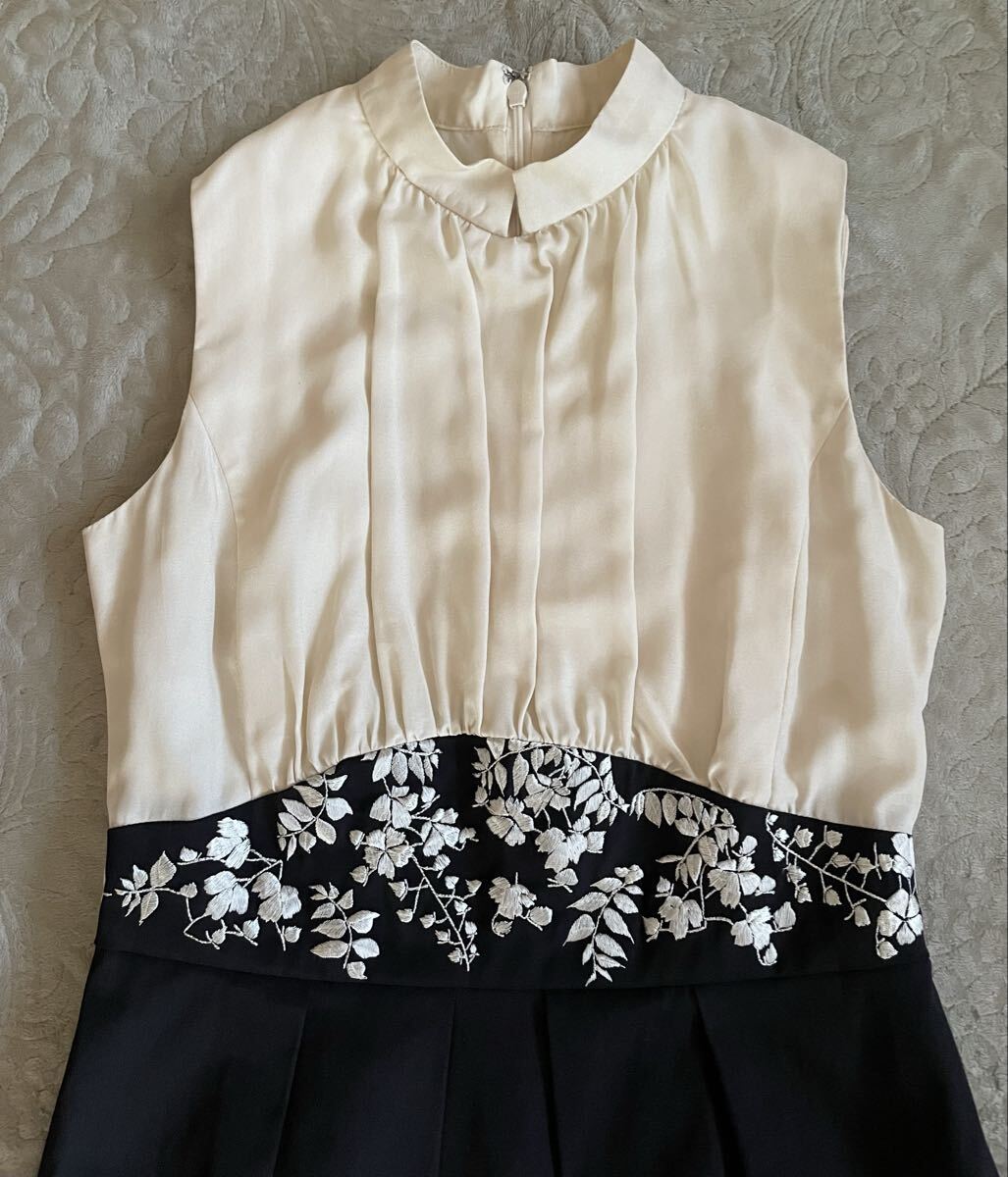 - スーナウーナ 刺繍 ワンピース ノースリーブ 異素材 花柄 マオカラー アイボリー 黒 シルバー タック ドッキング 膝下丈 36