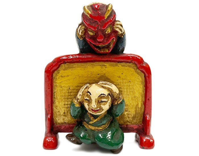 - 在銘 周山 赤鬼の面で遊ぶ子ども 童子 わらべ 根付 堤物 木彫 彩色 人形 置物 オブジェ ミニチュア 彫刻 骨董 美術 時代物 アンティーク