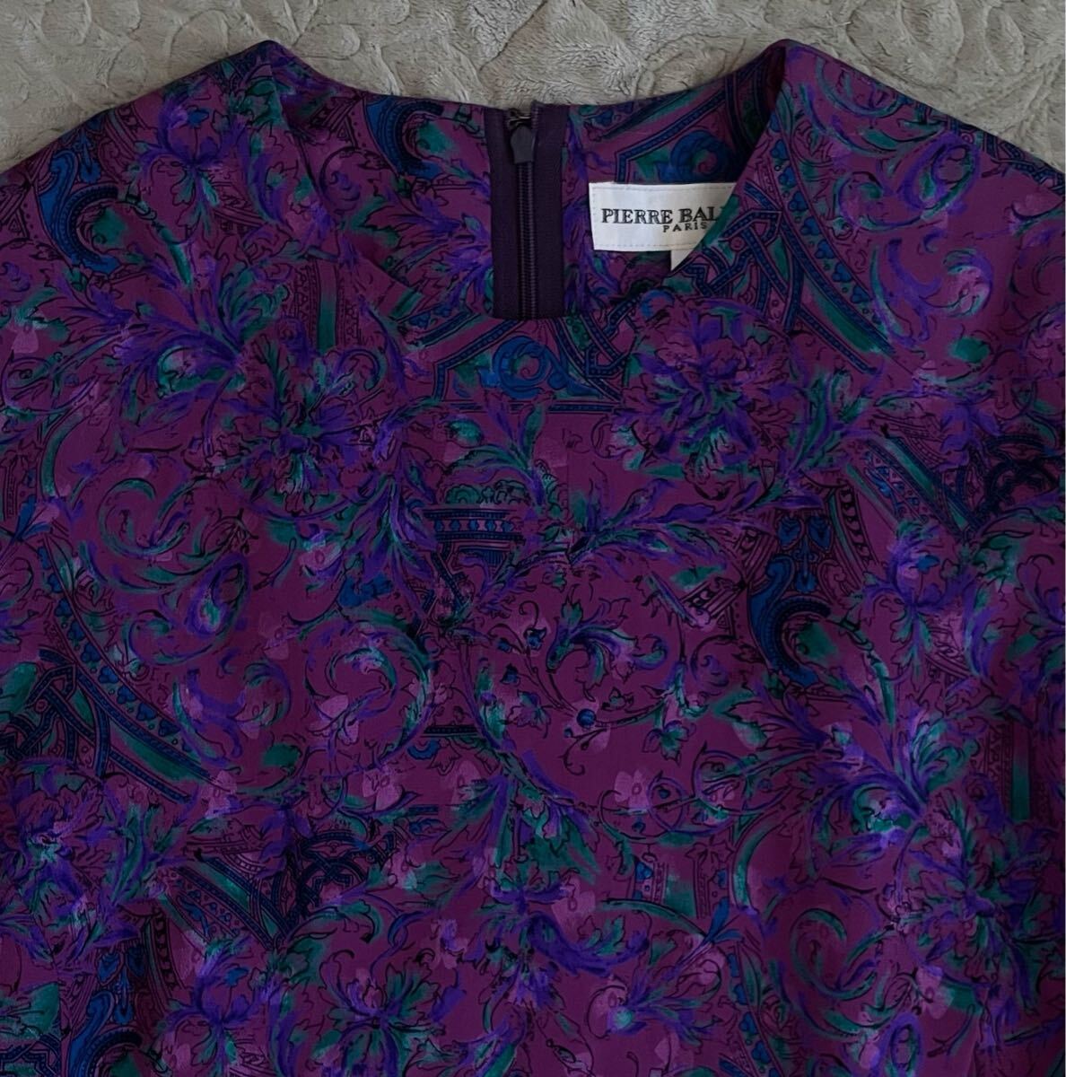- PIERRE BALMAINピエールバルマン絹100% ワンピース くるみボタン花柄ピンク紫アシンメトリー長袖リボン膝下丈タック シルク レトロ 9