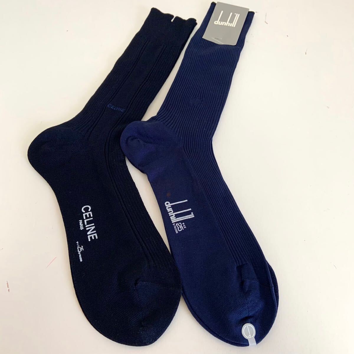 - 未使用 dunhill ダンヒル CELINE セリーヌ 靴下 2足セット 25cm 無地 ワンポイント ロゴ刺繍 メンズ 紳士 ビジネス ソックス まとめ売り